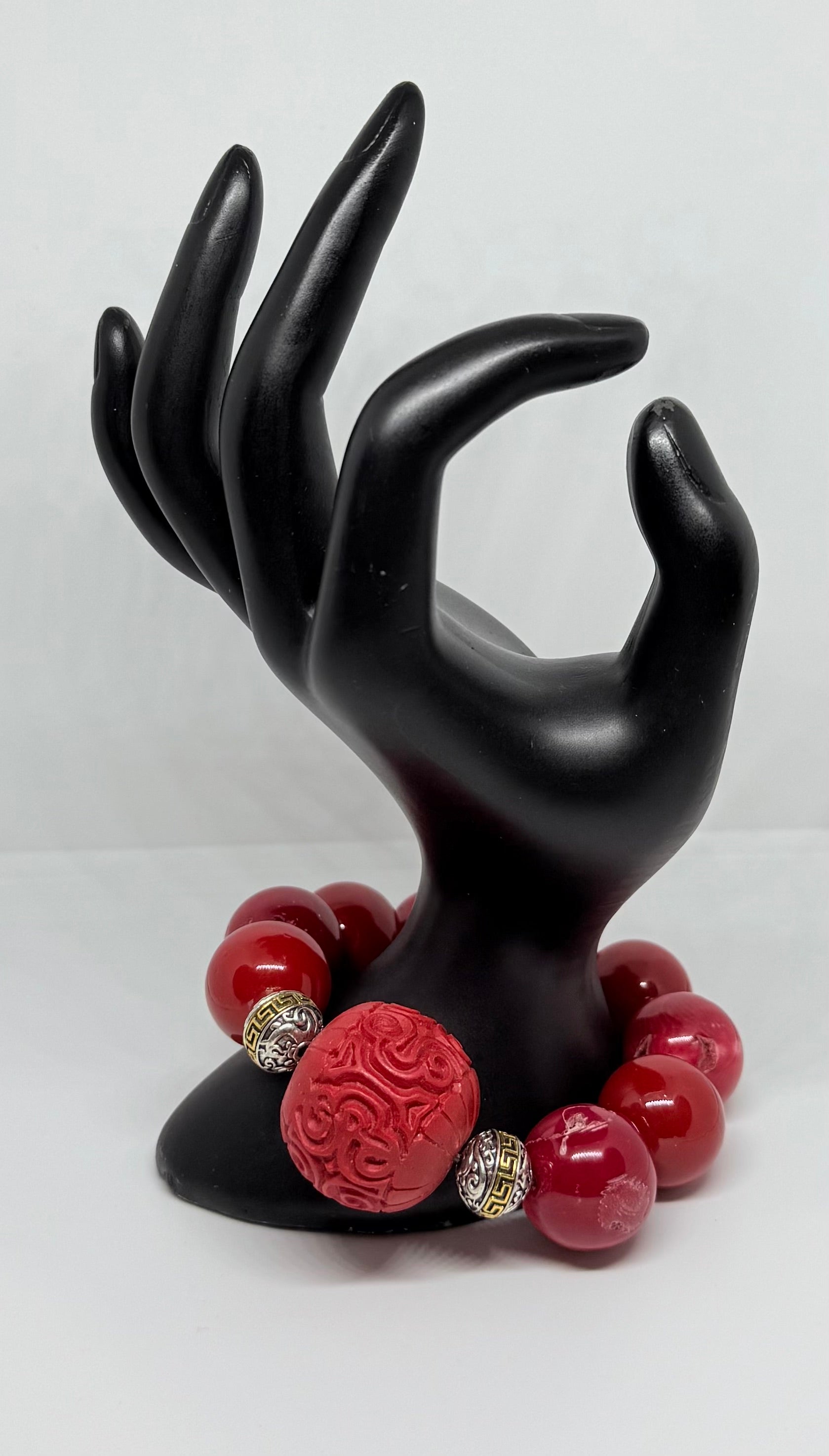 This Painted Coral and Pearl with Sinaba focal bracelet is made with 20 mm beads and round African Brass beads on stretch cord.