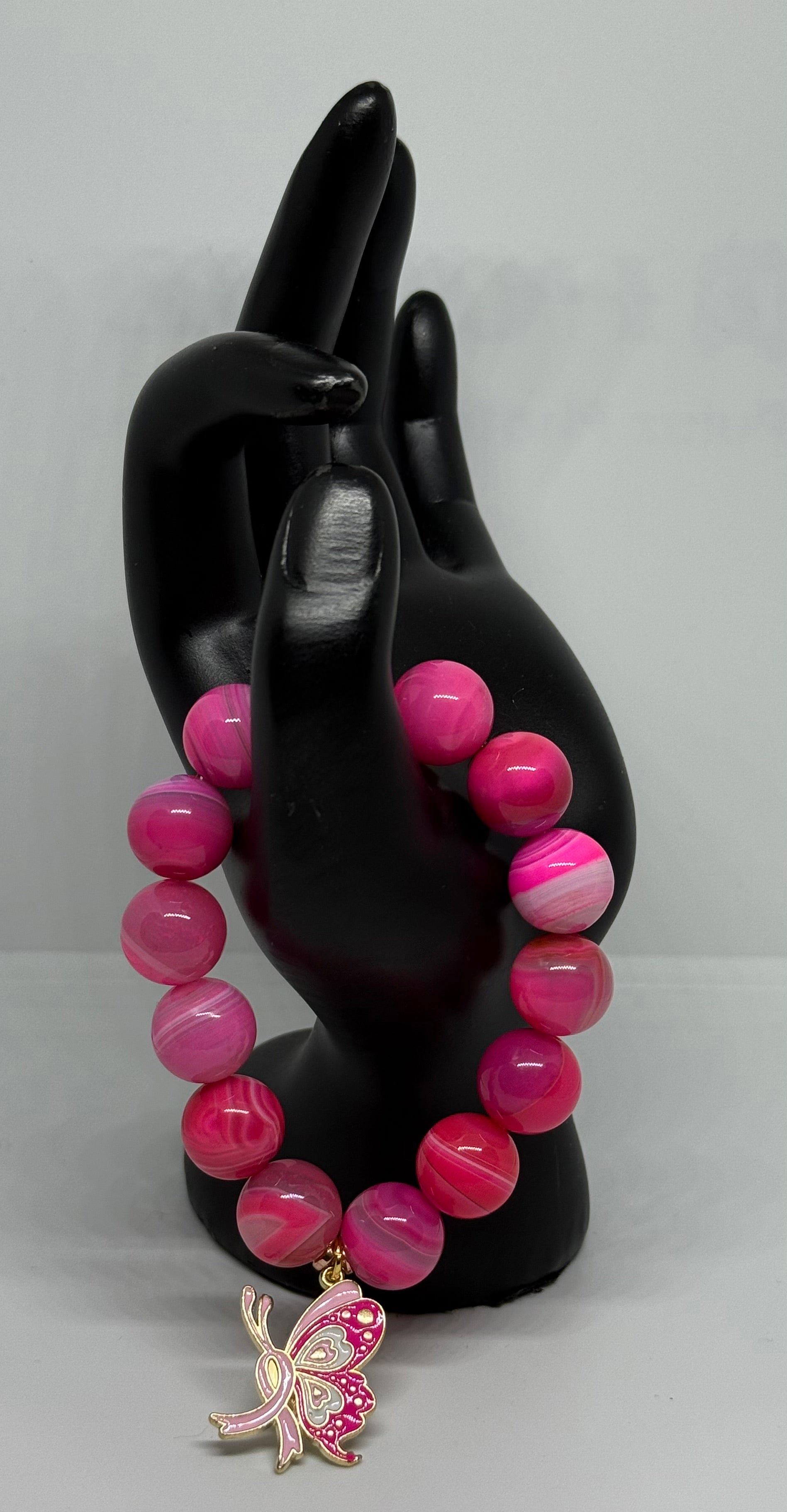 This Pink Striped Agate bracelet is made with 14 mm beads with a Hot Pink and Light Pink Butterfly Charm on stretch cord.
