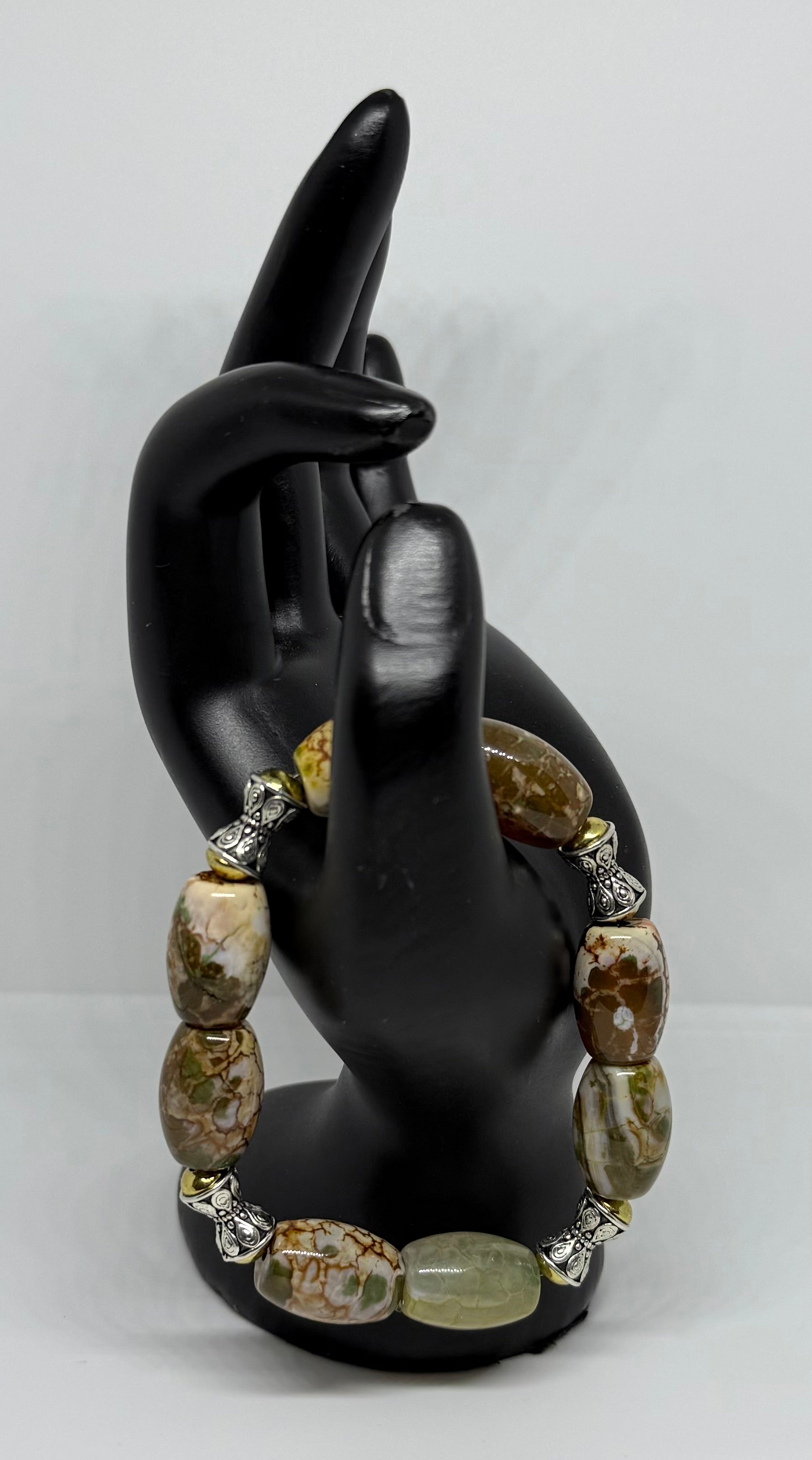 This Fire Agate Barrel bracelet is made with 13x18 mm beads with Brass spacers on stretch cord.
