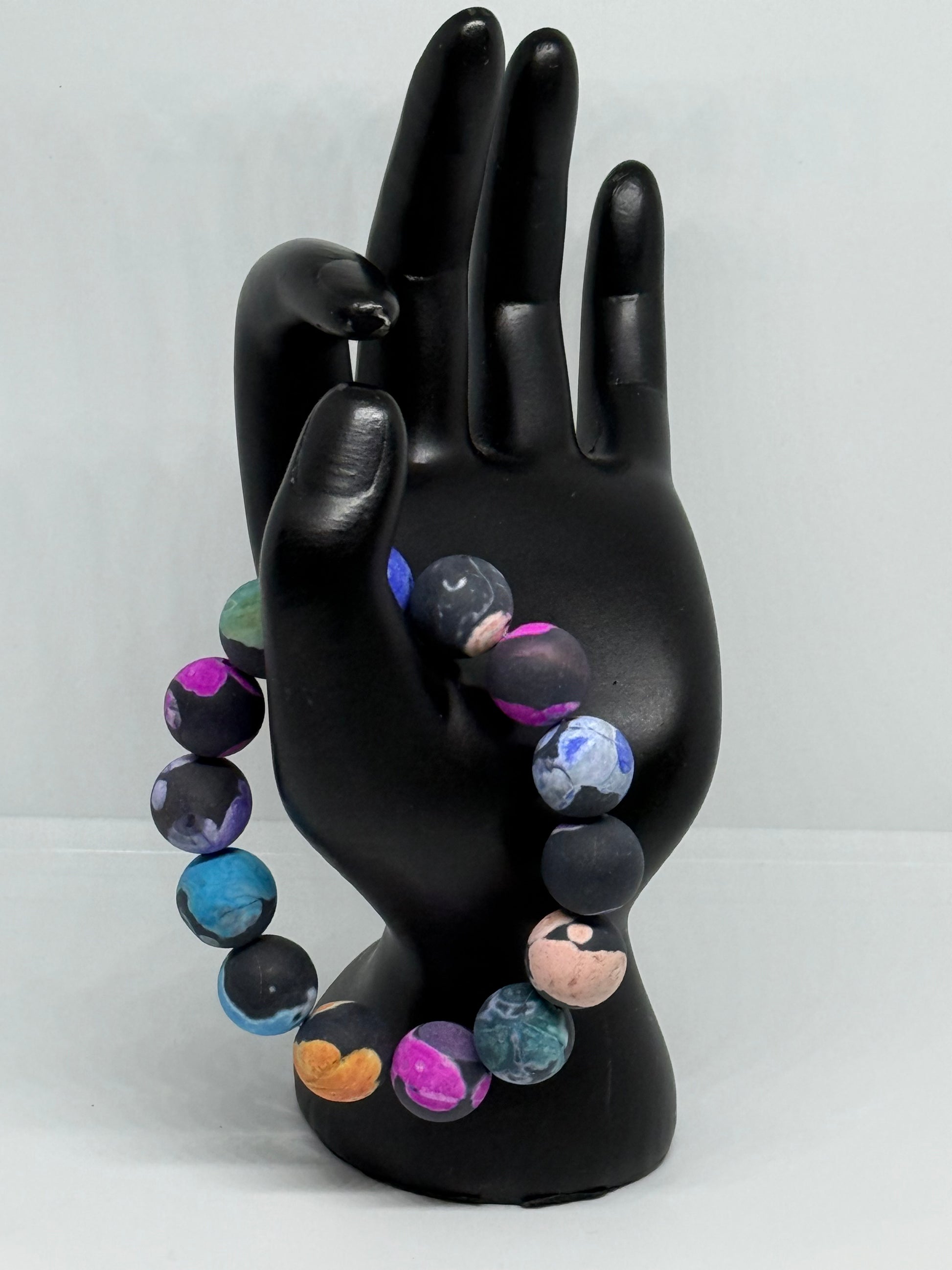 This Agate bracelet is made with 14 mm beads on stretch cord.