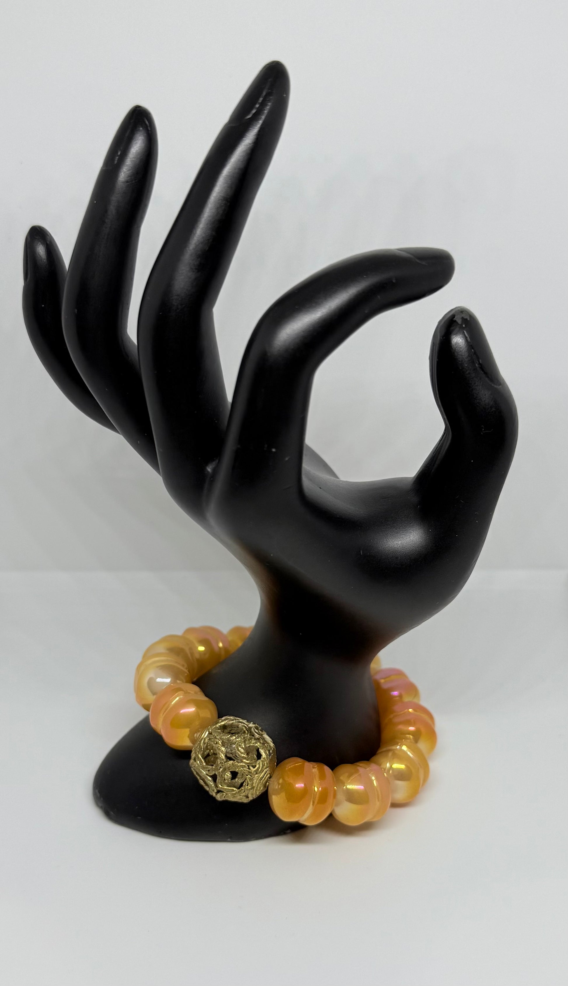 This Plated Glass bracelet is made with 16 mm beads and a round Brass focal on stretch cord.